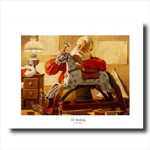 Old St Nick Santa Clause Building Rocking Horse with ELVES by Tom Browning Christmas #6 Art Print Gold Frame +GLASS 19x23" Perfect for Festive Holiday Fireplace Mantel
