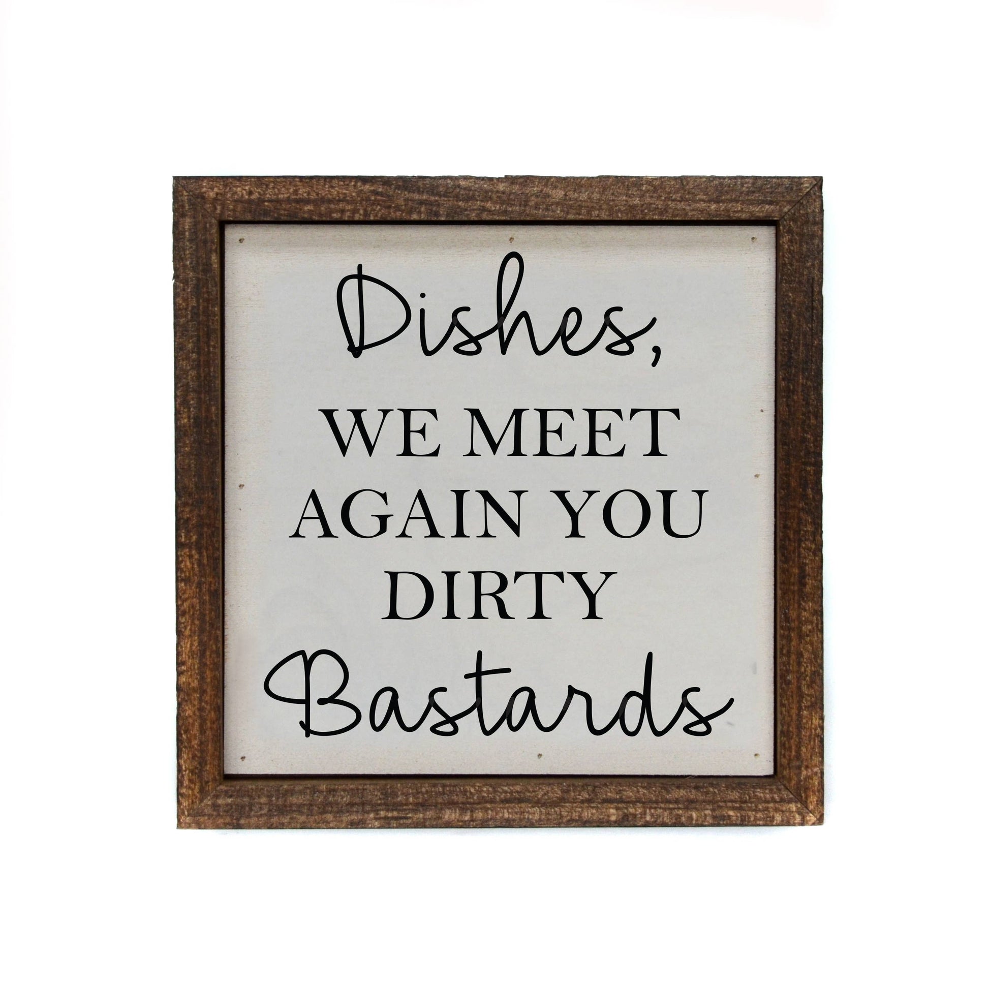 Dishes, We Meet Again Wood Sign or Shelf Sitter. All our signs are build into a wooden box frame with a rustic touch. Signs are hung directly off the frame or will stand up right on a table or shelf.